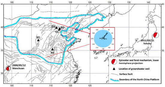 Distribution of five groundwater wells (black triangles) and epicenter positions of earthquakes that caused co-seismic water-level or tidal record changes in the North China Platform (outlined in blue) along with the corresponding rose diagrams of fracture orientation distribution around the five wells [92].