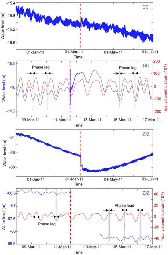 Water levels of two wells, GC in Tianjin Gaocun and ZJZ in Beijing Zuojiazhuang, were monitored both before and after the Tohoku earthquake. The red dashed line shows the time of the earthquake. Following the earthquake, the water level in well GC responded to the seismic waves, while the phase difference between the water level in well ZJZ and the theoretical solid tide underwent significant changes. The period with no data corresponds to the reset time interval of the sensor after the earthquake [92].