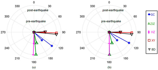 The changes in the fault orientation corresponding to the five wells are shown in Figure 9 after the 2008 MW 7.9 Wenchuan earthquake (a) and the 2011 MW 9.1 Tohoku earthquake (b). The shorter lines indicate the pre-earthquake orientation, while the longer lines indicate the post-earthquake orientation. Among them, the changes in the orientation of the GC, ZJZ, and BD wells are largest [92].