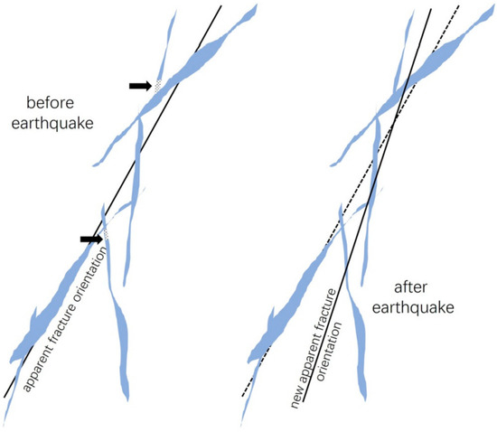 Given the minimal stress exerted by distant seismic waves, it is highly improbable that seismic waves directly lead to the formation of new fractures. More plausible is that the fluid flow oscillations caused by seismic waves alter the interconnectivity and apparent orientation of existing fractures (Figure 12) by either clearing or obstructing pre-existing flow channels [92]. The process of fracture unclogging is frequently cited as a mechanism for permeability variations due to dynamic stresses: this phenomenon has been observed in laboratory settings [95,96,97,98], field studies [77,99,100,101,102,103,104], and numerical simulations [105], potentially leading to shifts in the apparent direction of hydraulically conductive fractures.