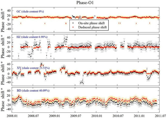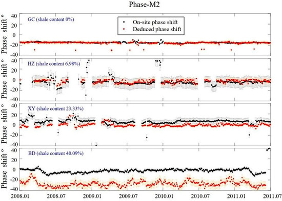 Zhang-Manga et al. (2022) [92] utilized a model that integrates the tidal response of fractures to the O1 and M2 tidal components for the calculation of fracture orientations (strikes and dips) within aquifer–caprock systems. The study employed the sign of the phase shift and magnitude of the amplitude ratio of the M2 and O1 tides in five wells situated on the North China platform, as illustrated in Figure 9 [92].