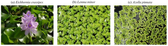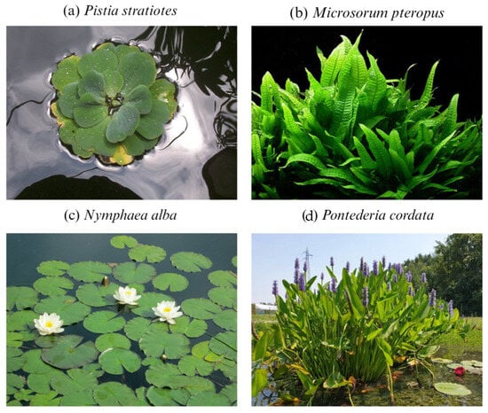 Aquatic macrophytes are a set of diverse photosynthetic organisms that can be seen by the naked eye and belong to different divisions of the kingdom Plantae, such as Chlorophyta, Bryophyta, Pteridophyta and Spermatophyta [35]. The availability of aquatic macrophytes from more primitive divisions is lower than that of vascular macrophytes. As shown in Figure 1, aquatic macrophytes are generally categorized based on their growth forms, such as emergent macrophytes (pickerelweed, tape grass), submerged macrophytes (American pondweed, Chara), free-floating macrophytes (duckweed, pistia) and floating leaf macrophytes (fragrant waterlily, spatterdock) [36].