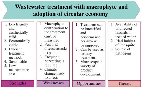 Phytoremediation is a biological treatment method using plants to eliminate contaminants from wastewater, groundwater and soil [29,30]. Subsequently, wherever possible, the extracted resources, along with the plants, will be used for other purposes, such as animal feed production [8], drug formulation [31], bioenergy production [32] and soil fertility improvement and reclamation [33]. The suitability of macrophytes in post-treatment resource recovery and product development frames the floating phytoremediation process as a cradle-to-cradle (C2C) design, which is a novel approach to eliminate waste and create a circular economy. In this context, floating phytoremediation is regarded as an efficient and environmentally friendly method for the treatment of wastewater [34]. In this paper, we discuss the use of selected floating aquatic macrophytes (FAMs) in the removal of various pollutants and present the post-treatment potential of selected FAMs regarding their contribution to a circular economy. This approach can validate the effects of combining macrophytes with other treatment methods for the protection of water bodies.