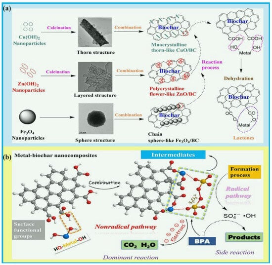 (a) The synthesis of CuO/BC, Fe3O4/BC, and ZnO/BC leads to the creation of lactones. (b) Understanding the activation mechanism of PS in metal/biochar nanocomposites [].