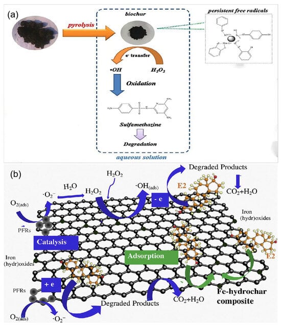 The Fenton-like reaction mechanism of iron-rich biochar can be delineated as follows: (1) Surface multivalent iron sites directly activate H2O2 to produce •OH or, under acidic conditions, leached Fe2+ on the surface activates H2O2 to generate •OH, as shown in Equations (50)–(53) and (7); (2) H2O2 can be activated by the single-electron transport mechanism of PFRs to produce •OH; (3) within a photo-Fenton system, the illumination facilitates the degradation of H2O2 and the subsequent production of •OH, concurrently promoting the regeneration of Fe2+, as presented in Equations (54) and (55); (4) Fenton-like systems mainly utilize •OH as the main free radical-degradation pollutant. Furthermore, biochar made from sludge possesses a porous composition and expansive surface area, enabling it to efficiently absorb various pollutants.