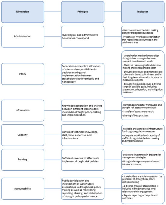 The OECD [] developed a framework for assessing blocking mechanisms in the context of multi-level water governance. The OECD [] identifies seven gaps that prevent effective governance in complex and interdependent situations. Water governance is a typical example of such a context because of its interlinkages with other sectors like agriculture, spatial planning and transportation. It is multi-level governance that relates to the sharing of policy making authority, responsibility, development, and implementation at different administrative and territorial levels. Within this framework, seven essential dimensions of effective multi-level drought risk governance are distilled. The dimension administration refers to the match between hydrological and administrative scales and boundaries. Since upstream measures may have an impact on downstream water availability, ideally, decision making must be harmonized on the basin level. The policy dimension addresses the separation and allocation of roles and responsibilities between different policy fields relevant for water governance. Information deals with knowledge generation and sharing between the different stakeholders involved in decision making. Capacity is about the sufficiency of technical knowledge, staff, time, expertise, and infrastructure, while funding deals with the availability of enough revenue for sub-level governments who can effectively implement water policies. The objective dimension concerns agreement and cooperation between relevant ministries. Lastly, accountability deals with public participation and involvement in water policy making, as well as the monitoring and the reporting and sharing of information on water policy performance.