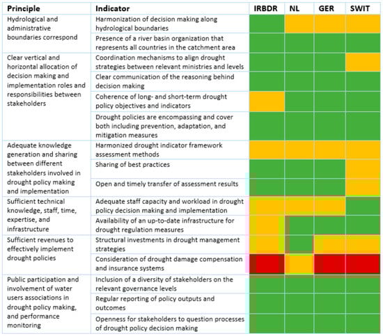 We have combined the data from the analysis of the policy documents and the interviews in order to “score” the presence of our indicators in the multi-level drought risk governance praxis of the Rhine basin. Our qualitative interpretative analysis resulted in assigning traffic light scores to indicate whether the practice corresponds with the indicator (a green score), partly meets it (a yellow score), or needs urgent improvement (a red score).