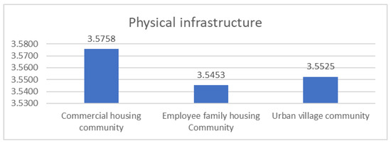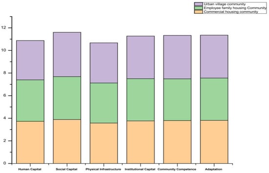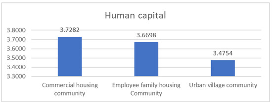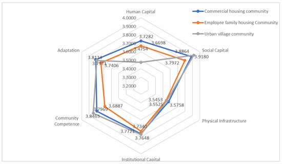 - Specifically, commercial housing communities scored highest in the three dimensions of human capital, physical infrastructure capital, and adaptation. Urban village communities scored highest in the three dimensions of social capital, institutional capital, and community competence, and employee family housing communities scored the lowest in each dimension.