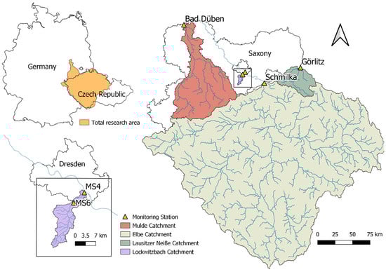 The data evaluated in this study originates from five monitoring stations in Saxony, Germany (Figure 1 and Table 1). The large (sub-) catchments of Elbe (51,387 km2), Mulde (6207 km2), and Neiße (1418 km2) are monitored by the Saxon State Operational Agency for Environment and Agriculture (BfUL), and data was provided by the Saxon State Office for the Environment, Agriculture, and Geology (LfULG). Sensor maintenance and calibration was carried out approximately bi-weekly by BfUL, and data went through a manual correction process. At Lockwitzbach (84 km2), there are two stations operated by the Chair for Urban Water Management of TU, Dresden [32]. The stations are about 6 km apart; one is located before the stream reaches the city of Dresden (MS6, upstream Dresden), the other shortly before the confluence with Elbe (MS4, downstream Dresden). Weekly site visits and bi-weekly sensor calibration were carried out at both monitoring stations, and analyzed data were corrected by the staff of the institute. According to the results of the latest river management plan period, all four waterbodies fail to achieve a good chemical status, particularly due to the exceedance of annual average concentration limits of total-phosphorus, mercury, and polycyclic aromatic hydrocarbons [33].