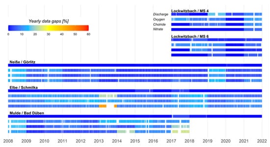 Discharge data were selected from flow gauges at the respectively shortest distance to the water quality stations. At Elbe, Vereinigte Mulde, and Lausitzer Neiße, the BfUL operates flow gauges not further away than 7 km from the water quality stations. At Lockwitzbach, flow rates were established at the monitoring sites. Monitoring periods of the water quality recordings were 5 years (Lockwitzbach), 10 years (Mulde), and 14 years (Elbe, Neiße). On average, 7% of the three water quality parameters (nitrate-nitrogen, chloride, and dissolved oxygen) were missing every year. The recorded discharge data were more complete, with 2% of data missing per year. Highest gap was found for MS4 in 2019, with 16% of data missing. About 23 million measurement points were evaluated; the length of the datasets, as well as their completeness, are shown in Figure 2.