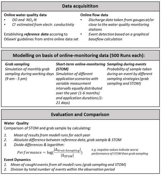 To answer the initial research question of how the results of STOM compare to grab sampling, we performed a systematic subsampling of the previously described data. Figure 3 gives a quick overview of the entire modeling process. Results for three sampling strategies were calculated, namely grab sampling, STOM sampling, and event sampling, further described in the next subchapter. All calculations were carried out with R; functions and scripts can be found on github (see credentials) [36].