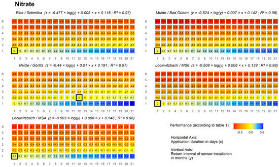 For a general overview of the comparison between STOM and grab sampling, the mean of all yearly performances (according to Figure 3) were calculated and concluded as a heat map. Results for single years can be found in the supporting material. The parameters were chosen from the 6 × 21 matrix (1–6 months return interval and 1–21 days of sensor application duration) and selected to favor a lower interval of return over the duration of the sensor application. For example, if a similar performance of zero was achieved for either a 3 month return interval and 20 days of sensor application, or for a 2 month return interval and 2 days of sensor application, the first parameter set was chosen (as a longer application is feasibly easier than a regular installation of the sensor). The predicted intercepts, or break-even points, where STOM becomes more accurate than grab sampling are marked in the following graphs with a black frame. Differences between empirical (the number in the box) and fitted intercepts of the performance index are caused by deviation between the mixed linear regression model and resampling data. The results of the five monitoring stations are sorted by parameter and catchment area.