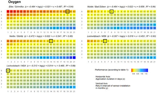 In contrast to grab sampling, STOM obtains continuous monitoring data in defined, limited intervals and for limited durations. The duration of the STOM application was selected between 1 and 21 days (the term sensor application duration is used for this dimension in the following). For application intervals, the limits were set from once per month to once every 6 months (the term return interval is used for this dimension in the following). For these time series, we applied the previously explained regulations, according to the OGewV guidelines. The two parameters (application duration and return interval) were varied, and sampling was simulated 500 times. A 6 × 21 matrix was obtained for the means of the model run for every year and parameter at a monitoring station.