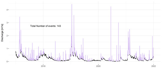 Results of event detection algorithm at Lockwitzbach—MS6. Purple lines are selected events from the hydrograph (black lines).