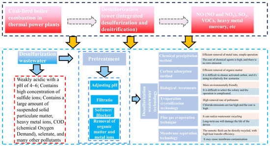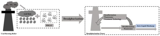 In recent years, the concept of zero liquid discharge has been strongly advocated in industrial wastewater treatment. As shown in Figure 1, this technology reduces the pollutant content of wastewater through certain technical treatments, so that it constantly tends to be a means of zero wastewater treatment. With this treatment method, not only can the resources in the wastewater be recycled, but it also effectively reduces the pollution of wastewater discharge to the environment. However, the desulfurization process will produce a large amount of desulfurization wastewater, the composition of which is quite complex, which mainly includes water, sulfuric acid, sulfate, suspended solids, and other components [4,5]. Sulfides (SO2) are converted into sulfuric acid and sulfates during this transformation process. Although this process effectively reduces the emission of pollutants into the air, it introduces these chemicals into the wastewater. The concentration and types of sulfuric acid and sulfates are significantly influenced by the desulfurization techniques and types of raw materials used [6]. For example, the use of different desulfurizing agents or the adoption of different operating conditions during the desulfurization process can lead to variations in the concentrations of sulfuric acid and sulfates in the wastewater [7]. In addition to sulfuric acid and sulfates, desulfurization wastewater also contains a large amount of suspended solids, which primarily include unreacted desulfurizing agents, ash, and other solid particles [8]. The coal type and its combustion mode, boiler load, denitrification catalyst, desulfurization agent, and many other factors jointly affect the composition of desulfurization wastewater, which results in a continual change in the water quality of desulfurization wastewater in the process of desulfurization. The main characteristics of desulfurization wastewater include the following: (a) it is weakly acidic, and its pH value is 4~6; (b) it contains a high concentration of sulfide ions; (c) the wastewater contains a large number of suspended solid particles, heavy metal ions, COD (chemical oxygen demand), selenate, and many other pollutants [9]. Dyes and toxic elements [10] that cause environmental pollution are mixed into drinking water and thus threaten human health. The direct discharge of untreated desulfurization wastewater will seriously damage the water quality structure, erosion of soil, and corrosion of large industrial equipment pipelines, etc., which will cause serious harm to the human body and the environment [11]; therefore, how to effectively deal with the desulfurization wastewater has become the focus of many scientific research units and enterprises to study the problem. As shown in Figure 2, this paper introduces the characteristics of traditional desulfurization wastewater treatment technology and summarizes the main zero-discharge desulfurization wastewater treatment technology.