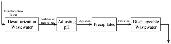 The process flow of the chemical precipitation method is shown in Figure 3. The chemical precipitation method mainly removes pollutants such as heavy metals and suspended solids from desulfurization wastewater through neutralization, precipitation, flocculation, and other processes [12]. The chemical precipitation method is an effective method of treating desulfurization wastewater by introducing specific chemical agents to induce the precipitation of pollutants in the wastewater to form solid particles, thus realizing the purification of the wastewater. This method involves the collection of samples of desulfurization wastewater from the desulfurization system to understand the composition and nature of the wastewater, and via testing and sample analysis, the main types and concentrations of pollutants in the wastewater are determined. Next, the pH of the wastewater is adjusted, usually by adding a neutralizing agent Ca(OH)2, and proper pH adjustment contributes to the mildness of the treatment environment and promotes subsequent chemical reactions and precipitation formation [13]. In general, precipitants for pH adjustment include Ca(OH)2, NaOH, FeCl3, and AlCl3 [14]. These chemicals react with sulfides, suspended matter, etc. in the wastewater to form insoluble precipitates. At the same time, the formation and dispersion of the precipitates are induced by stirring or mixing to ensure an adequate reaction. Subsequently, the precipitate is separated from the treatment tank by filtration. Finally, the chemically precipitated water is treated to ensure that the water quality meets discharge standards.