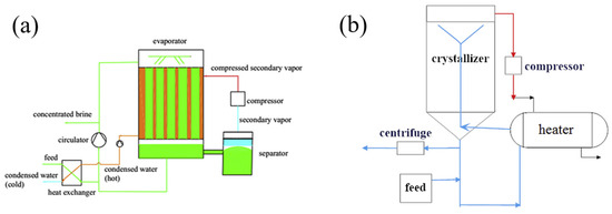 (a) Mechanical vapor recompression crystallization experimental system, (b) MVRC system for desalination of ammonium sulfate wastewater [24].