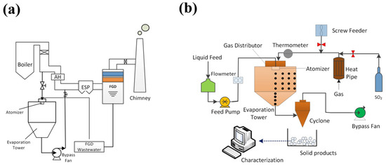Flue gas evaporation technology has reasonable operating costs, requires no additional energy input, and can realize zero discharge performance. Therefore, it has been widely applied in chemical, metallurgical, and electric power industries. In order to further optimize the zero liquid discharge technology of desulfurization wastewater, Fu et al. [30] compared experimental and simulation results in a 330 mW coal-fired power plant and obtained key operating parameters such as boiler loading conditions, the ratio of the number of droplets captured by the flue wall to the total number of droplets, the optimization of the arrangement of atomization nozzles, the diameter of atomized droplets, the enthalpy of flue gases, the exact calculated value of flue gas changes, and the characteristics of the fly ash after injection of the desulfurization wastewater. It was found that under different boiler loading conditions, the higher the temperature and the faster the flue gas velocity, the shorter the time required for the complete evaporation of wastewater droplets. Different amounts of desulfurization wastewater can be completely dried with little change in fly ash properties and no negative impact on downstream processes. This wastewater evaporation treatment method is characterized by short process, low investment, low operating cost, and low maintenance. In addition, Ma et al. [31] proposed an independent bypass evaporation tower technology on the basis of flue gas evaporation technology and made a detailed study on its efficiency in removing hazardous substances in desulfurization wastewater. The process of desulfurization wastewater treatment and experimental setup are displayed in Figure 8.