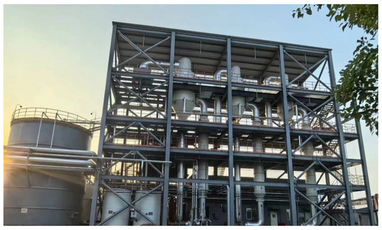 This process can be realized by heating evaporation and cooling crystallization to remove hazardous substances from the desulfurization wastewater. According to the U.S. Environmental Protection Agency, two new gas-fired power plants in Texas used GE’s zero liquid discharge system to treat circulating cooling water, mainly using brine concentration and crystallization treatment processes, with a reuse rate of more than 98% [22]. Li et al. [23] took the desulfurization wastewater of a coal-fired power plant as the actual research object, designed the system process flow, and carried out an experimental study combining wastewater pretreatment with evaporation and crystallization. In the pretreatment stage, sodium sulfate was added to the water, and then the effluent was pumped into the evaporation crystallization device to prepare high-purity sodium chloride based on the method of gypsum crystallization. The experimental results show that the zero-discharge system treatment technology of desulfurization wastewater from this power plant is feasible and can realize the crystalline salt resource utilization. The purified sodium chloride salt crystals have a purity of more than 99.10%, which meets the standard for industrial use. The results provide an idea of resource recycling for the treatment of desulfurization wastewater using evaporative crystallization technology. In addition, a similar technology is also reported by Lu et al. [24], as shown in Figure 6.