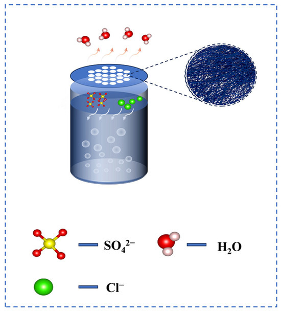 The experimental results show that after the desulfurization wastewater is evaporated, Na+, Mg2+, and Ca2+ are removed, except for a small increase in Cl−. However, the release of chlorides during evaporation hinders further application of the technology. Ma et al. [32] proposed that the use of Ca(OH)2 to adjust the pH of desulfurization wastewater to 9.0–10.0 can effectively inhibit the volatilization of HCl in flue gas. Chen et al. [33] used the single droplet drying method to study the chloride release characteristics during evaporation and proposed three periods of chloride release based on the rate of chloride release and the characteristics of wastewater droplets (mass, temperature, and diameter) for the first time. During the free water evaporation period, almost no released chloride can be detected. During the unstable shell phase, 19.8% of the chloride is released, mainly due to the increase in droplet temperature. During the shell pyrolysis phase, nearly 10% of the chloride is released, which is directly related to the hydrolysis of chloride salt hydrates in the evaporating particles. Therefore, it is important to find a balance between chloride release and evaporation efficiency in engineering practice. In addition, they found that the evaporation products of single-drop drying and spray drying were similar in composition, with the main components being MgCl2, CaCl2, NaCl, and CaSO4, and the mass fraction of chloride in the final product was less than 0.06% [34].
