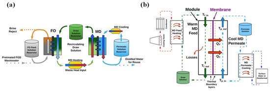 Schematic diagram of the process: (a) FO/MD desulfurization wastewater treatment system, (b) FO/MD heat exchange system [45].