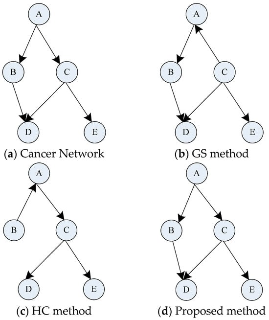 As seen from Table 3, the Bayesian network structure obtained from this method was the least in the cases of the missing edge, multilateral edge, and reverse edge, and the score of the Bayesian network structure was also the highest among the three methods. Moreover, under the same scoring function value, this method had the highest probability of finding the best Bayesian network structure.