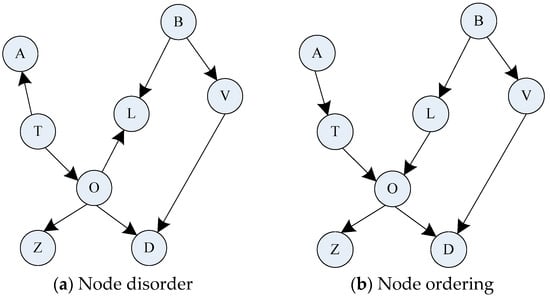 In order to verify the performance of the improved genetic algorithm, this study compared the time performance, accuracy, and the final score of the Bayesian network structure with various algorithms under the same sample conditions. Figure 6 shows the structure obtained by learning the Bayesian network structure with the improved genetic algorithm under the conditions of disorder and order.
