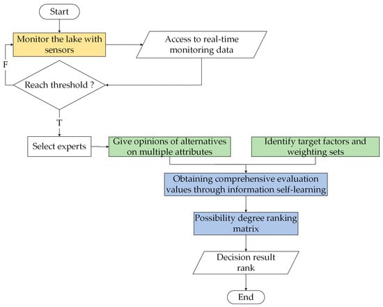 Based on the decision-making model, the evaluation information of experts in water environment management and the real-time water quality monitoring data are used as inputs for the decision-making algorithm. The results of ranking the pros and cons of the management methods that have taken into account the decision-making objectives and are in line with the current state of water quality can be obtained, and the results can be used as a reference for the main body of the decision-making process. The decision-making process for emergency management of river and lake algal bloom is shown in Figure 1.