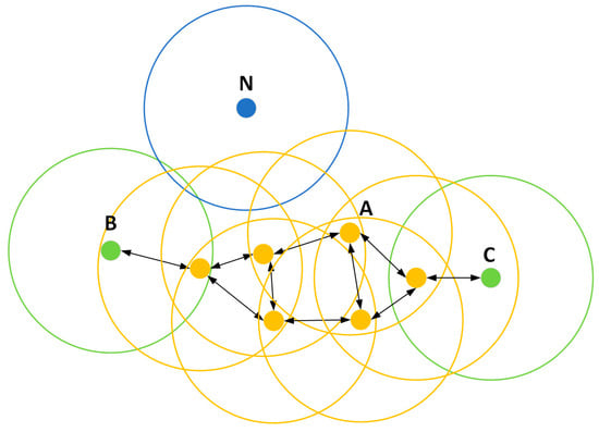 In the figure, A is the core point, the number of points in the radius r around it is greater than or equal to the minimum number of points (minPts), then these points will be classified as a cluster. B and C represent the border points, the number of points in the radius r around it is less than the minPts, but it belongs to the boundary of a certain cluster and will be classified into this cluster. N is the noise point, the radius r around it is also less than the minPts, is regarded as outliers or noise points, and does not belong to any cluster. N is an outlier, the number of points in radius r around it is also less than the minPts, it is regarded as an outlier, and it does not belong to any cluster. DBSCAN algorithm does not need to pre-specify the number of clusters and the shape of the clusters, but it is automatically determined by the density threshold, so for some complex datasets, DBSCAN can achieve better results than the traditional clustering algorithm.