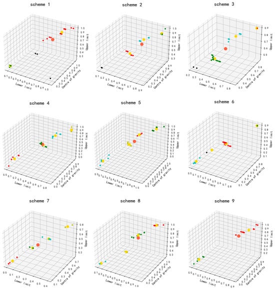 Using the DBSCAN algorithm, the clustering result graphs and indicators of the nine methods are obtained. The number of cluster classes and points in the cluster is obtained and the center of gravity of the cluster is calculated. In order to ensure the comprehensiveness of the evaluation, the noise points are also grouped together. In order to obtain the final evaluation value of the method, different weights were given to each cluster. The weight of the noise cluster is set to 0.1, and the weight of the rest of the clusters is proportional to the number of particles in each cluster. Finally, the center of gravity of each cluster is weighted and summed. The obtained value is the comprehensive evaluation value of the method, to achieve automatic rational decision-making. The clustering results and the weighted results of each method are shown in Table 4.