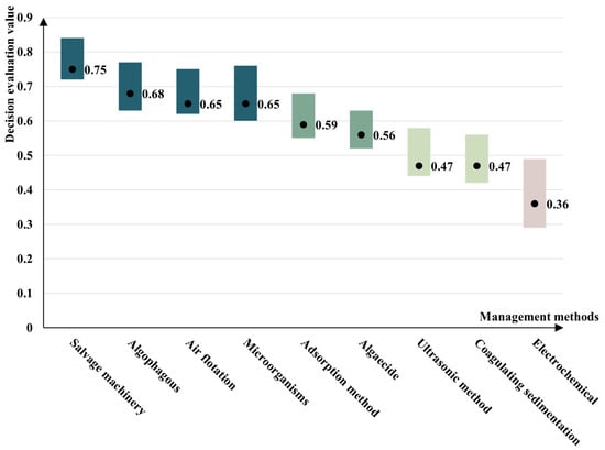 The analysis of the decision-making results in Sanjiadian Reservoir reveals that the managers’ objectives revolve around two main aspects: the degree of environmental impact and the overall investment scale. These two factors play a crucial role in determining the prioritization of treatment methods. In line with the characteristics identified during the early research phase, the mechanical algal-removal method and the algal-feeding biological method emerge as the top-ranked options. The high ranking of these methods can be attributed to their favorable attributes in terms of environmental impact and investment requirements. The decision-makers aim to strike a balance between achieving effective algal bloom control and managing costs efficiently. The findings of this analysis provide valuable scientific references for the managers involved in algal bloom treatment decision-making. By considering a range of factors, including environmental impact, investment requirements, and treatment efficiency, the decision-makers can make informed choices that best meet their objectives and the specific needs of the Sanjiadian Reservoir. This enhanced decision-making process ensures a more balanced and sustainable approach to algal bloom management, ultimately benefiting both the ecosystem and the management goals.