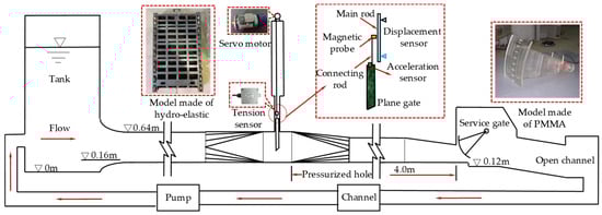 A physical model with a scale of 1:25 was established to simulate the structural layout of a hydraulic engineering project under similar gravity and flow conditions, mainly including an upstream tank, vertical shaft of the plane gate, pressurized hole, service gate chamber and drainage channel (in Figure 1). In the model test, the orifice size of the plane gate was 0.24 m × 0.48 m (width × height). The gate size was 0.312 m × 0.50 m (width × height). There was a backward dip of 30° at the gate bottom. The gate was supported by roller supports with seals on the upstream side, and it was lifted using a single lifting point with a speed of 0.01 m/s. The service gate was 4.0 m away from the downstream side of the plane gate in the model test, and its orifice size was 0.28 m × 0.26 m (width × height).