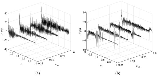 The fluctuation in the hoist force is plotted in Figure 5. When the esg is small, the hoist force is kept approximately constant at first as the plane gate drops. When the opening degree of the plane gate is smaller than 0.4, the fluctuation in hoist force increases gradually until the gate stops moving at esg = 0.25, as displayed in Figure 5a. Under the condition of constant upstream water depth, the larger the esg, the greater the fluctuation of the hoist force. As the esg increases, the time of hoist-force fluctuation occurs earlier. Figure 5b exhibits the hoist-force fluctuation in the gate-opening process. The relationship between the hoist-force fluctuation and the opening degree of the plane gate is the same as that of the gate-closing process, and it is affected by the impact effect of the water–gas two-phrase flow behind the plane gate.