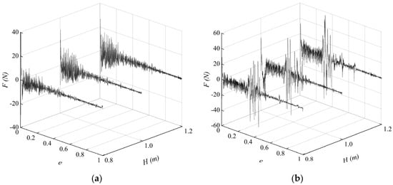 Figure 6 shows the influence of upstream water depth on the hoist-force fluctuation for esg = 0.25. Comparing the gate-closing process (in Figure 6a) with the gate-opening process (in Figure 6b), it is found that the upstream water depth change mainly affects the intensity of hoist-force fluctuation. But, in fact, the opening degree of the service gate in the downstream direction significantly affects the time-history variation characteristics of the hoist-force fluctuation, compared to Figure 5.