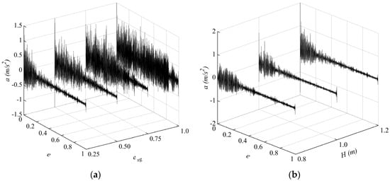 Figure 7 shows the acceleration of the slip–stick vibration in the gate-closing process. It is seen that the variation in acceleration is consistent with that of the hoist-force fluctuation. Under the same upstream water depth, the esg significantly affects the variation characteristics of the vibration acceleration in Figure 7a. As the esg increases, both the time of the gate slip–stick vibration stage and the amplitude of vibration acceleration increase. Nevertheless, as shown in Figure 7b, the upstream water depth has an effect on the intensity of the vibration acceleration at a given esg but has no significant influence on the time-history variation characteristics.
