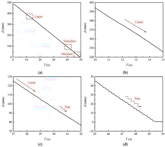 Figure 8a shows the displacement in the gate-closing process at H = 1.2 m and esg = 0.25. The displacement of the plane gate can be divided into three stages: non-vibration, transition and slip–stick vibration. In the non-vibration stage, the displacement decreases linearly (in Figure 8b). In the vibration stage, the displacement decreases in a stepwise manner (in Figure 8d) because of the gate slip–stick vibration with a flutter in the model test. In the transition stage from non-vibration to vibration, the linear decrease is gradually changed into a stepwise decrease (in Figure 8c).