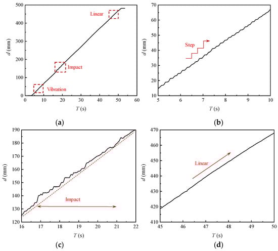 Displacement in gate-opening process: (a) overall; (b) vibration; (c) impact; (d) linear.