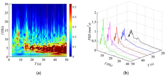 The vibration displacement spectra in the gate-closing process are obtained through wavelet analysis []. Figure 10 exhibits frequency spectra characteristic of vibration displacement in the gate-closing process at H = 1.2 m and esg = 0.25. As shown in Figure 10a, the red region denotes the significant region of the dominant frequency, and the dominant frequency tends to decrease and becomes more significant as the plane gate drops. Figure 10b exhibits the power spectral density (PSD) of the vibration displacement. The intensity of slip–stick vibration is increased, and the dominant frequency becomes more significant with the gate-closing time, which better reflects the variation characteristics of the slip–stick vibration in the gate-closing process.