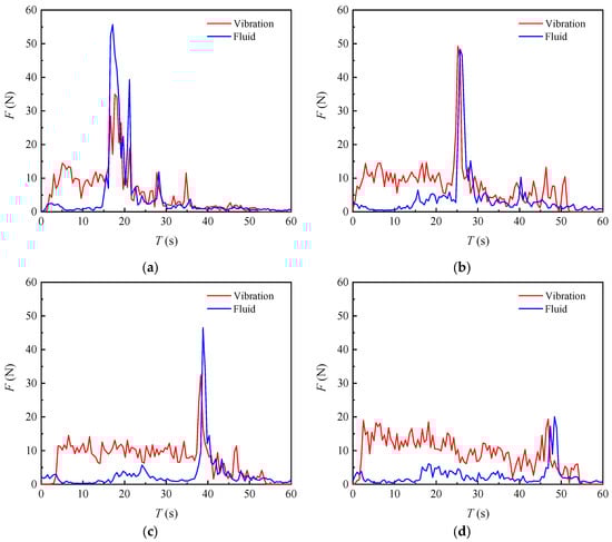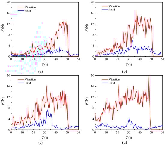 Force comparison between fluid excitation and slip–stick vibration in gate-opening process: (a) esg = 0.25; (b) esg = 0.50; (c) esg = 0.75; (d) esg = 1.0.