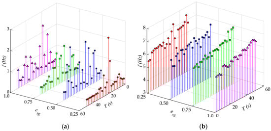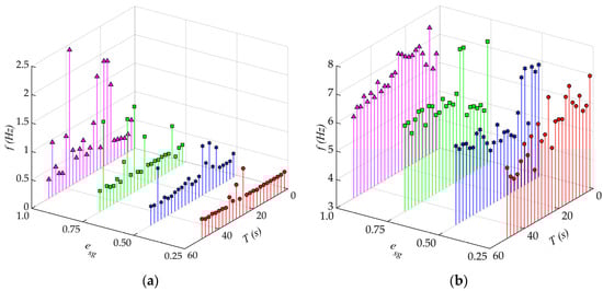 Figure 11 shows the frequency characteristics of the vibration displacement in the gate-opening process at H = 1.2 m and esg = 0.25. In the initial stage of the gate-opening, the dominant frequency of slip–stick vibration is significant, as shown in Figure 11a. As the plane gate is lifted, the intensity of the slip–stick vibration weakens and the peak intensity of PSD decreases, as displayed in Figure 11b. A comprehensive comparison between Figure 10 and Figure 11 shows that the slip–stick vibrations in the gate-opening and gate-closing processes have the same characteristics. That is, the dominant frequency of slip–stick vibration gradually becomes significant, and the peak intensity of PSD gradually increases with the decrease in the opening degree of the plane gate.