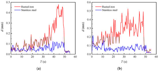 Figure 16 shows the influence of the plane gate support material on the slip–stick vibration at H = 1.2 m. As can be seen from Figure 16, the slip–stick vibration intensity of the stainless-steel supported gate is significantly reduced compared with that of the rusted-iron supported gate under the same water level, indicating that the friction characteristics between the gate support and the track cause the difference in the slip–stick vibration intensity. However, there are few studies on the friction characteristics between gate supports and tracks. In the different gate-support-material model tests, the fluid excitation acting on the plane gate body is almost the same as in the gate-closing process, which indicates that the fluid excitation has similar effects on the plane gate for the two model tests. When the plane gate is supported by a stainless-steel support instead of a rusted-iron support, the friction factor between the gate and track is changed, which mainly reflects in a different slip–stick vibration intensity in the model test results. Hence, the model results reveal that the friction characteristic of the plane gate support is the direct factor causing the slip–stick vibration of the plane gate, which can prove the rationality of the simplification of the friction relationship between the support and the track in the theoretical model [,].
