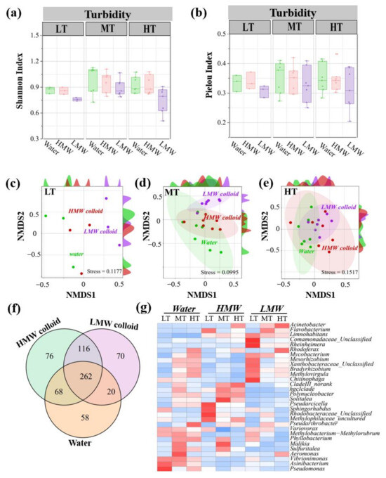 Diversity and composition of bacterial communities in HMW colloid and LMW colloids under three turbidity conditions. Shannon index (a), Pielou index (b), and non–metric multidimensional scaling graphs of bacterial communities of colloids in low, medium, and high turbidity groups (c–e). Venn graph of bacterial OTUs among water, HMW, and LMW colloids. Microbial aggregation in bulk water, HMW, and LMW colloids (f). Heatmaps of the top 30 abundance bacterial genera in bulk water, HMW, and LMW colloids (g). LT, MT, and HT represent low, medium, and high turbidity, respectively. HMW and LMW represent high and low modular weight colloids, respectively. Water represents bulk water (<1 μm).