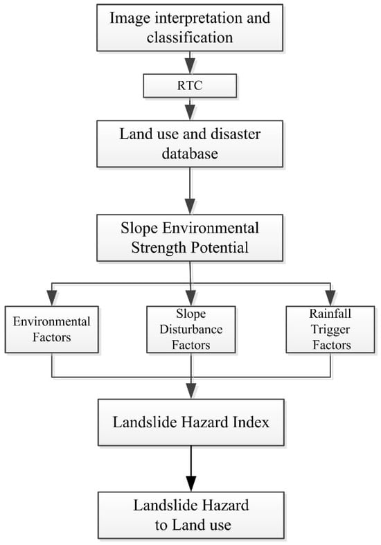 In the past, studies seldom focused on the landslide hazard to land use, therefore models for analyzing rainfall-induced landslide hazards to ensure adequate land use in mountainous areas are necessary. The data processing and flowchart of research work of the present study is shown in Figure 1. Coupled with the use of the ArcGIS platform, random tree classifier (RTC) was employed to classify and interpret satellite images to obtain land use information and disasters. Furthermore, considering the regional environmental characteristics and land disturbance, we analyzed the potential of slope environmental intensity, factors associated with slope disasters, and the rainfall characteristics of the study area and investigated the correlation between rainfall trigger and slope environmental strength potential to develop IRL. Our research findings can provide considerable references for the strategies of land use in mountainous settlements. However, only the influence from the natural environment was considered; the socio-economic, governmental policy aspects that should be overall considered in decision making for land use were excluded in this study. This could lead to the potential research direction in the next step.
