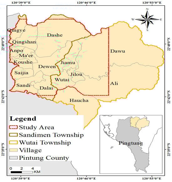 In Sandimen Township, the Sandi and Dalai villages have the highest (n = 1683) and lowest (n = 402) populations, respectively. In Wutai Township, Wutai and Jilu Villages have the highest (n = 1325) and lowest (n = 210) populations, respectively []. The residents of Sandimen Township are mainly Paiwan individuals (Taiwan Aborigines); some Rukai individuals also reside in this township such as in Qingye Village, which has recently been included in the Maolin National Scenic Area. The main economy in Sandimen Township is agriculture, and the main agricultural products are sweet potato, millet, taro, mango, pineapple, red quinoa, and coffee []. The residents of Wutai Township are mainly Rukai individuals []. The main agricultural products of the township are love jade, red quinoa, millet, coffee, taro, and sweet potato [].