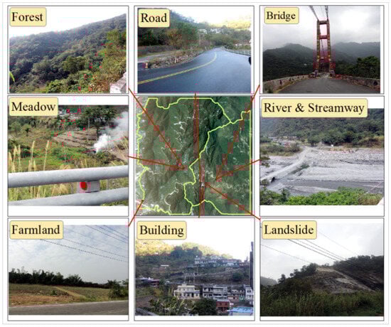 In this study, FS-2 or SPOT-5 satellite images of four typhoons or rainstorms were selected as the base map. Using GIS ArcGIS, each classification factor was manually digitized and circled. We compared the Tiff files of the satellite images (resolution, 2 m × 2 m) of the study area to increase the accuracy of the sampling area delineation; furthermore, we selected the following eight classifications suitable for the scope of this study: river, road, building, farmland, forest, meadow, streamway, and bare land (Figure 3).
