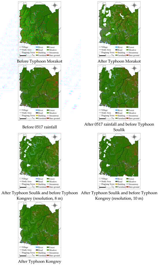 Considering the aforementioned eight classifications, the RTC module was used with the results of texture analysis to interpret the images. The research scope was interpreted using a total of six satellite images obtained before and after the 2009 Typhoon Morakot, 0517 rainfall in 2013, 2013 Typhoon Soulik, and 2013 Typhoon Kongrey. Figure 4 depicts the results of image interpretation. To confirm the accuracy of the interpretation results, we randomly selected a total of 25 points (interpretation grids; checkpoints) for each classification and compared them with high-resolution aerial photos and on-site survey data. The most common accuracy evaluation method is the error matrix [], which is used to calculate the coefficient of agreement (Kappa index) and overall accuracy. The value of the Kappa index proposed by Cohen [] ranges from 0 to 1. Kappa values of <0.4, 0.4–0.8, and >0.8 indicate low, medium, and high accuracies, respectively. Table 2 summarizes the OAs before and after the rainfall events in the study area. In this study, the average Kappa value of each satellite image was approximately 0.71, and the average overall accuracy was approximately 74% (medium to high accuracy).
