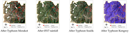 After image classification, to identify rainfall-induced landslides in the study area, we subtracted bare land grids before and after rainfall events by using the image subtraction method. The river, streamway, and bare land classifications with a slope percentage of <5% were deducted. High-resolution aerial photos of the study area were compared, and manual inspection was performed to identify landslides; then, the locations of the rainfall-induced landslides in the study area were obtained (Figure 5). Among the types of slope failure, debris slides were the easiest and most reliable type to be identified in the satellite images since vegetation was effectively stripped off from the slopes. Therefore, debris slides are the major landslides mapped in our study. The 2009 Typhoon Morakot resulted in the highest rainfall and the largest landslide area (1313.12 ha). The areas of landslides induced by the other events were as follows: 0517 rainfall in 2013, 813.92 ha; Typhoon Kongrey, 789.44 ha; and Typhoon Soulik, 635.04 ha.