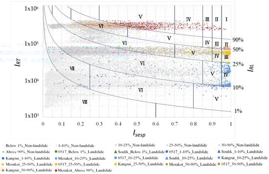 - IRL1: From the IRL values corresponding to the grid data of all rainfall-induced landslides in the study area, the value with a cumulative probability of 1% is selected (Weber’s method) and is indicated as IRL1. Grids with IRL values less than that of IRL1 have landslide probabilities of <1%.