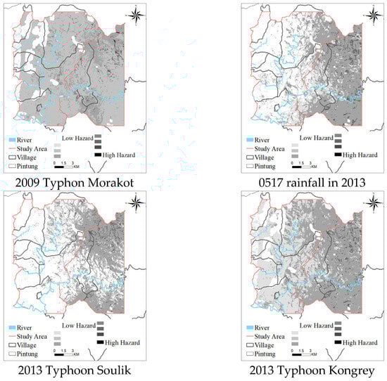 The hazard value of each interval was substituted into each grid of each rainfall event, and the hazard maps of the study area after each rainfall event were constructed (Figure 7). Hazard degree was classified into eight grades, and the classification was based on the method in Table 17. The IRT of 2009 Typhoon Morakot was the highest among all rainfall events, and the number of landslide grids was 8207; thus, the degree of landslide hazard in the study area after this typhoon was the highest. The IRT of 2013 Typhoon Kongrey was higher than that of 0517 rainfall in 2013; thus, the degree of landslide hazard after Typhoon Kongrey was higher than that after 0517 rainfall in 2013. The IRT of 2013 Typhoon Soulik was the lowest, and the number of landslide grids was also the lowest (n = 3969); thus, the degree of landslide hazard after this typhoon was the lowest.