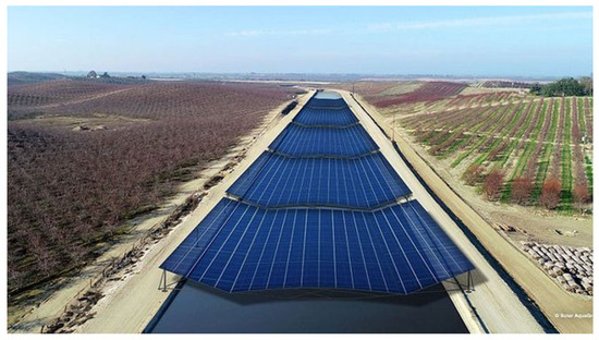 - McKuin, B.; Zumkehr, A.; Ta, J.; Bales, R.; Viers, J.H.; Pathak, T.; Campbell, J.E. Energy and Water Co-Benefits from Covering Canals with Solar Panels. Nat. Sustain. 2021, 4, 609–617. [Google Scholar] [CrossRef]